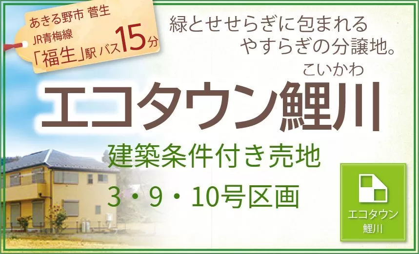 【物件概要】 ■物件名/エコタウン鯉川 3号区画・9号区画・10号区画■地番/東京都あきる野市菅生字若宮820-10ほか■交通/JR青梅線「福生」駅バス15分バス停「菅瀬橋」徒歩8分■販売棟数/3区画■土地/所有権(3号区画124.33㎡37.60坪)(9号区画124.48㎡37.65坪)(10号区画115.78㎡35.05坪)■面積計算方式/実測■地目/宅地(平坦)■接道/2号区画:南東公道(接面計ーm・3号区画南東側幅員5m・9-10号区画北西側道路幅員5m)■地域・地区/市街化調整区域・砂防地域■用途/第一種低層住居■建ぺい率/40%■容積率/80%■建物/木造サイディング貼2階建(間取例)■間取り/3号区画:4LDK(間取例)/9号区画:4LDK(間取例)/10号区画:3LDK(間取例)■完成・引き渡し時期/相談■公営水道・LPGガス・東京電力・浄化槽■売主/株式会社多摩企画センター■取引態様/(売主)